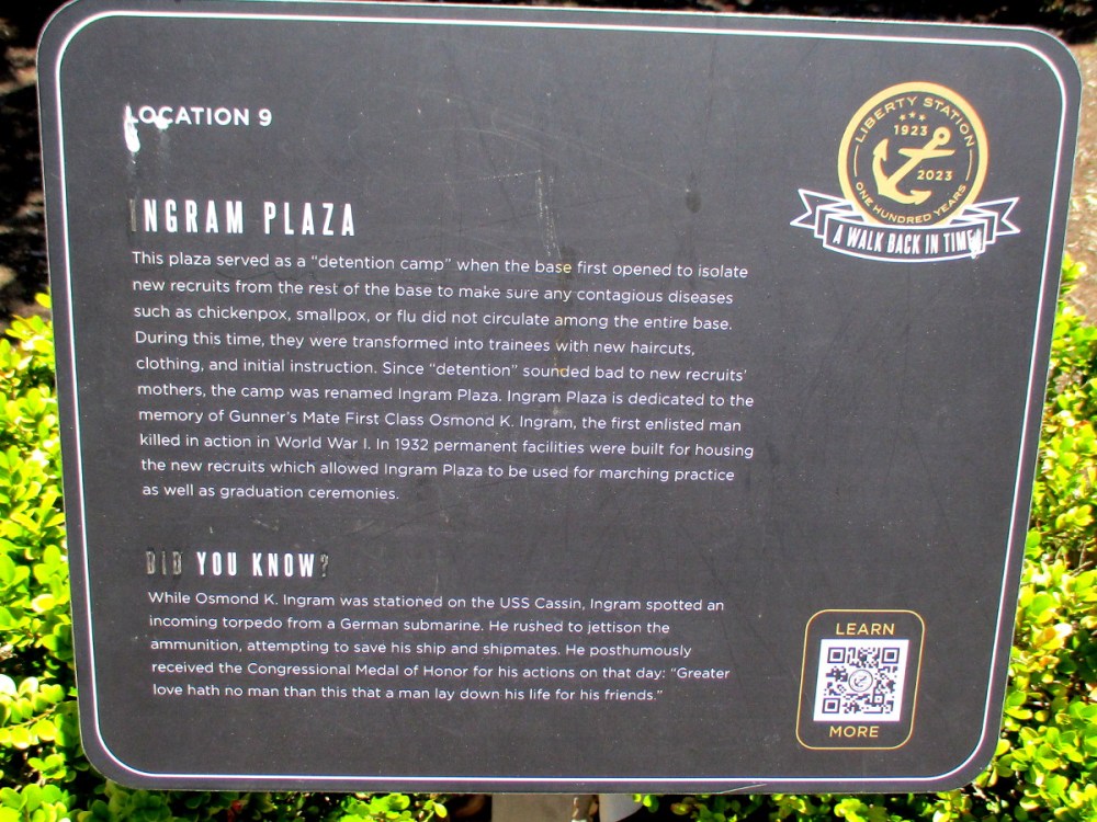 Ingram Plaza is a special place at Liberty Station in Point Loma. It can be found very easily by looking for the large American flag. Like all of Liberty Station, Ingram Plaza used to be part of Naval Training San Diego, which closed in 1997.