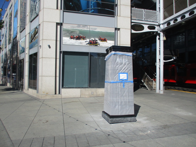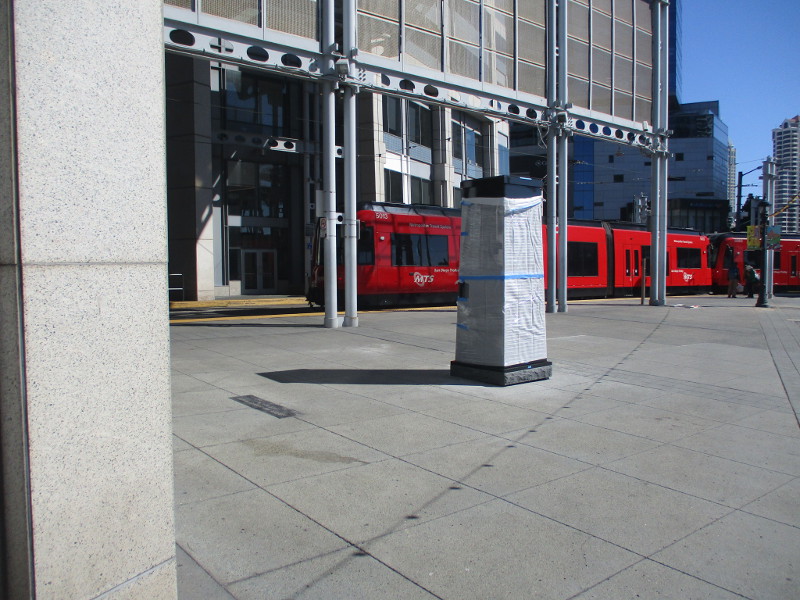 This afternoon, walking past downtown’s One America Plaza building, I noticed the black marble pedestal that will support a Navy SEAL frogman statue has been installed outside. You can see it in my first two photographs. The nearby America Plaza trolley station is in the background.