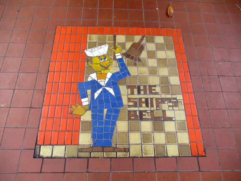 A little-seen mosaic greets people walking toward the door of Cocina 35 in Liberty Station. Tiles form the words: THE SHIP’S BELL. The colorful tiles embedded in the walkway form the image of a sailor ringing a bell. Why is it here?