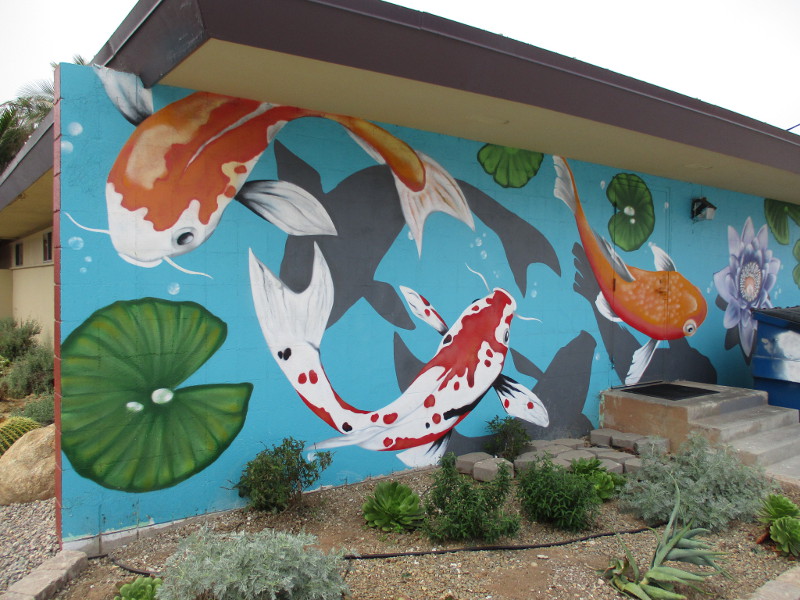 A nostalgic Pinball Machines sign in a Gaslamp Quarter window.A colorful koi pond mural in Ocean Beach.Flowers are like friends…they bring color to your world.Ladies who were dancing on the Embarcadero this evening pose and smile for my camera!Colorful graffiti art on the side of a produce delivery truck in Mission Valley.An awesome calavera San Diego shirt in a shop window!A happy wood stove. I spotted this neon art on Main Street in Ramona.A beautiful flower at the County Center/Little Italy trolley station.Gazing out at San Diego Bay from the Broadway Pier, shortly before sunset.