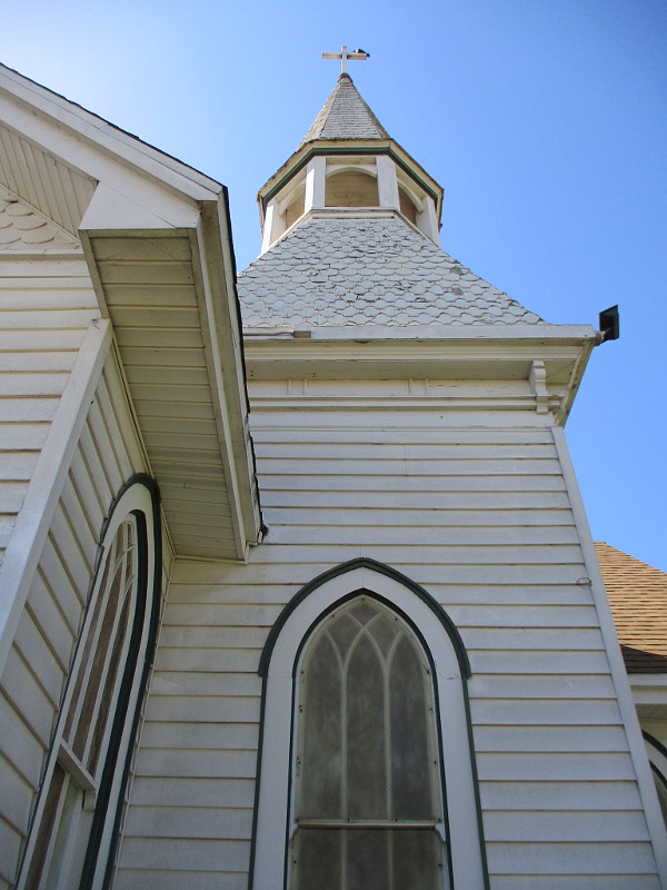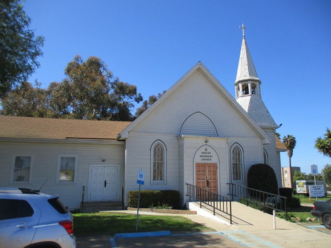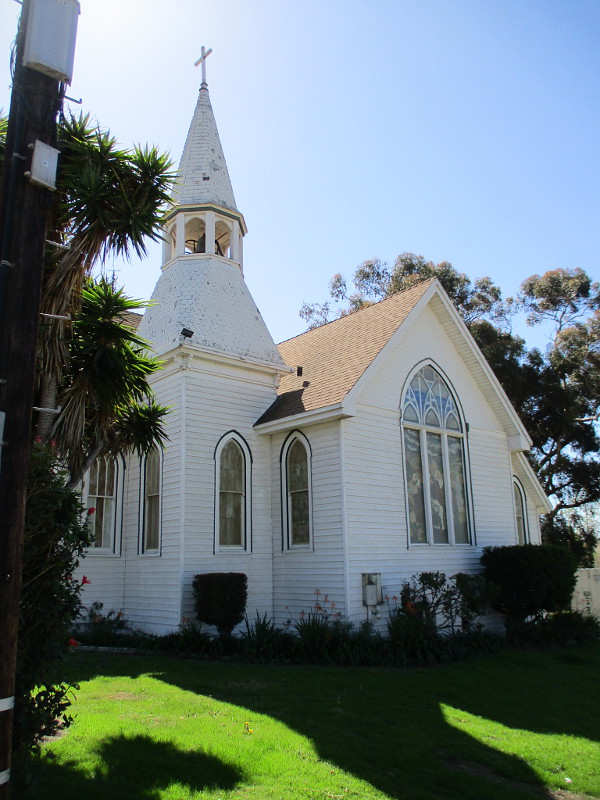 I was walking along Coronado Avenue, just west of Interstate 5, when I saw a white church with an old-fashioned steeple up a low hill. My feet turned toward it for a closer look.