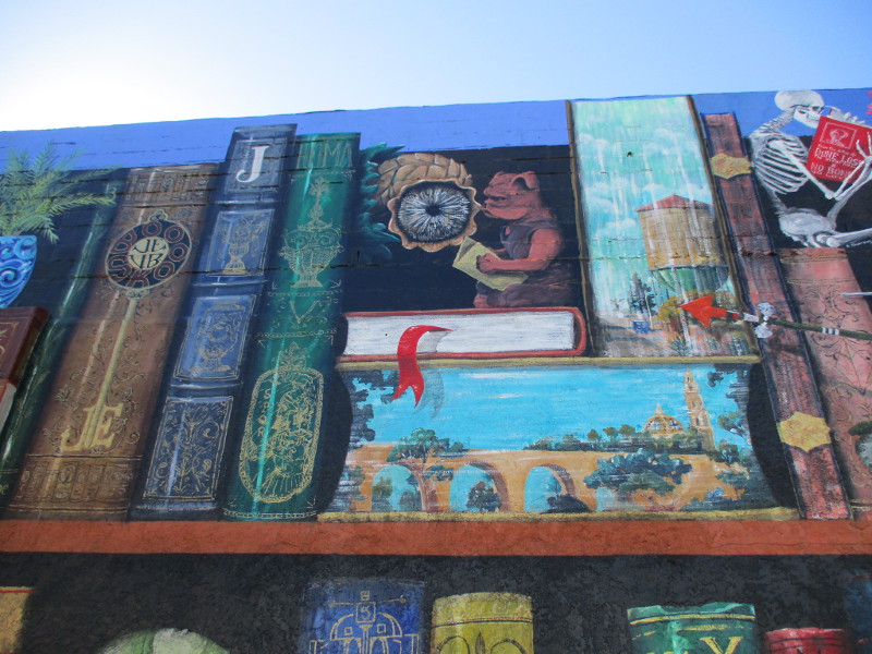 The subject matter of this huge mural is books, of course. And famous authors, and classic characters, and timeless stories! (Not to mention dinosaurs, Balboa Park, and the North Park water tower!)