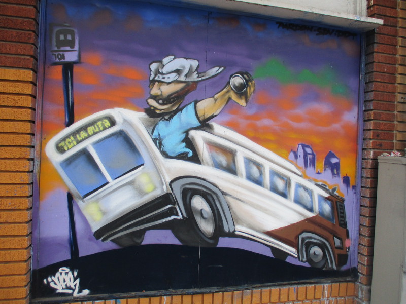 This colorful mural can be found on the north side of University, behind the 30th Street bus stop. A banner strung above it proclaims: Community art brought to you by the children of North Park. North Park Music Fest. North Park Main Street.