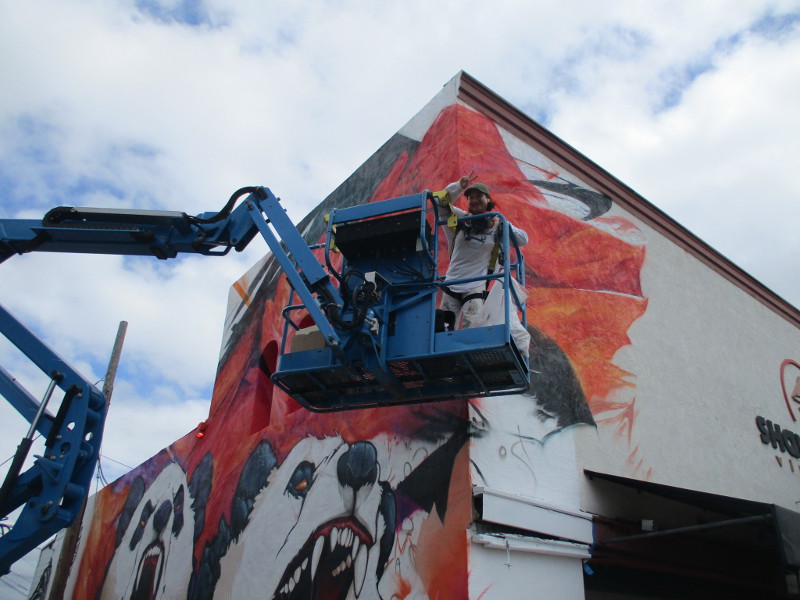 A very cool mural is now being painted on one side of the Shank & Bône Vietnamese restaurant in North Park! Up on a cherry picker, Thao Huynh French of Mindful Murals was spray painting bold color around two large, very fierce panda bears! She saw me and waved!