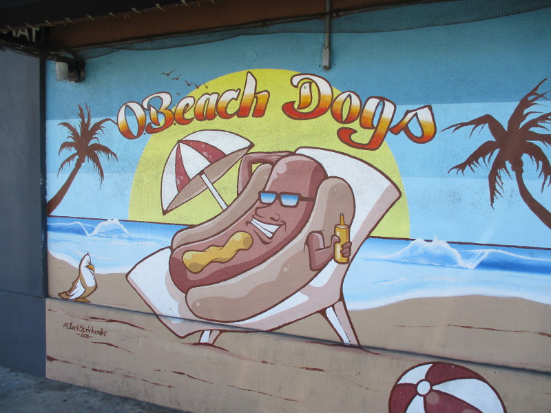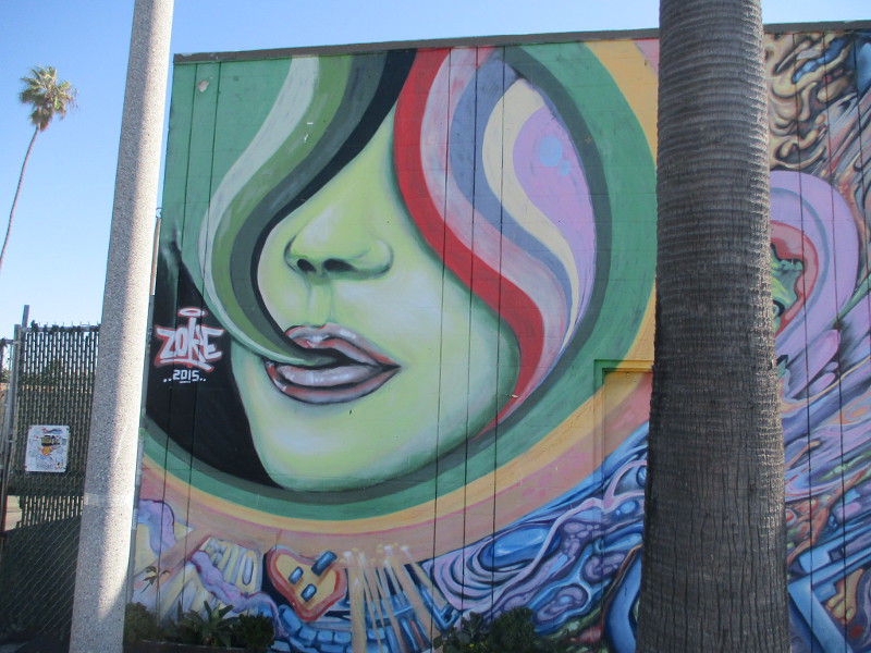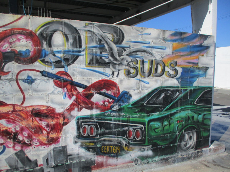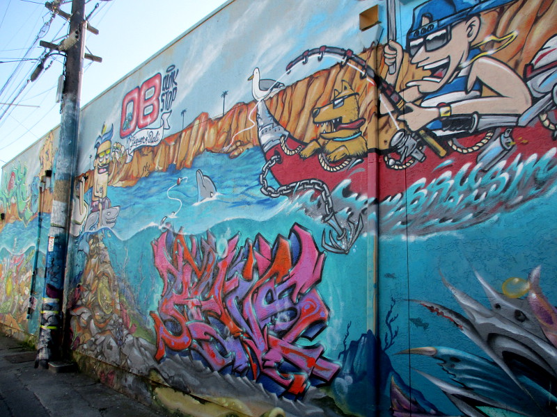 This delightfully crazy mural depicting a fisherman off Sunset Cliffs, a guy eating a sandwich while riding a shark, and what appears to be a lobster mariachi, was spray painted on the north side of OB Quik Stop Liquor & Deli. You have to proceed down the alley behind the building to view it.