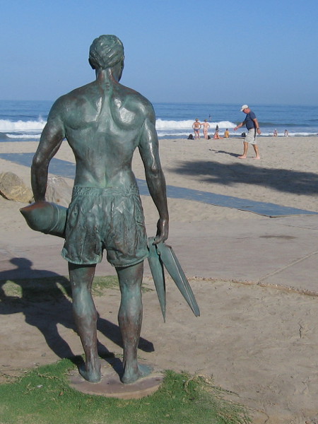 The sculpture represents a typical lifeguard, with head up scanning the Pacific Ocean surf. It’s a very fine addition to a very cool beach neighborhood.