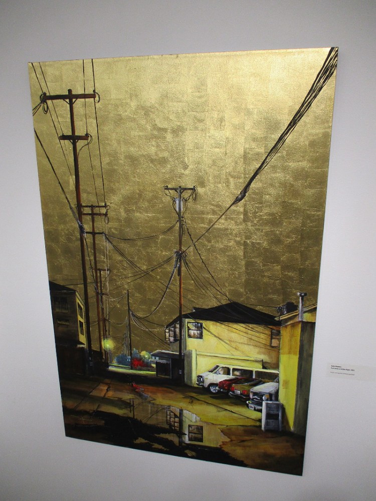 The hamburger paintings and a sculpture, by San Diego artist Duke Windsor, are made to shine with the application of gold leaf. He was inspired by the gilt religious icons in the collection of Balboa Park’s Timken Museum. (Would that make these hamburgers secular icons?)