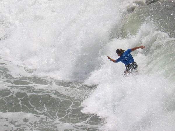 I got so many photos, I’ll break things up into two blog posts. This first post is my modest camera’s photos of the cool surfing action. I had to sharpen and alter the contrast on most images, but I’m surprised how decently many came out. I kept notes on the names of the surfers competing in each heat, but once I looked at my photos I wasn’t too sure who was who. So please excuse the fact that I don’t include the names of contestants in most captions.