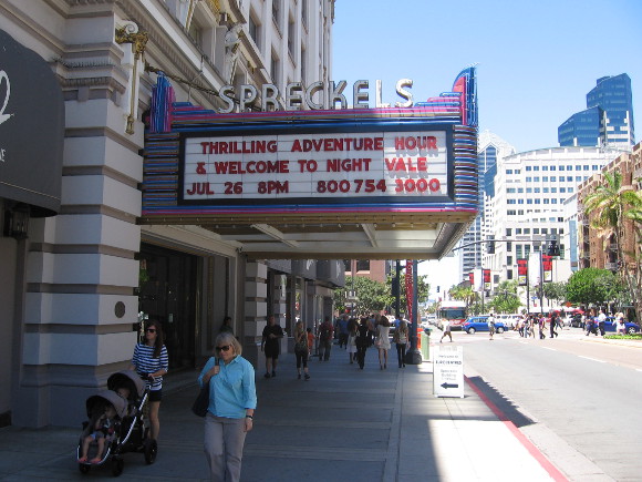 I must confess I’ve never seen a show at the historic Spreckels Theatre. I do occasionally sit at a table in the building’s Grand Lobby. On a quiet Saturday I’ll eat lunch and write while watching pedestrians pass down the Broadway sidewalk, just outside the glass doors.