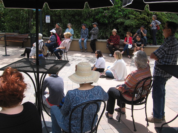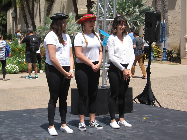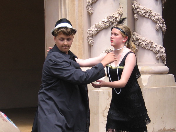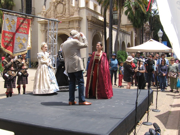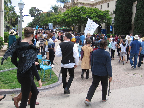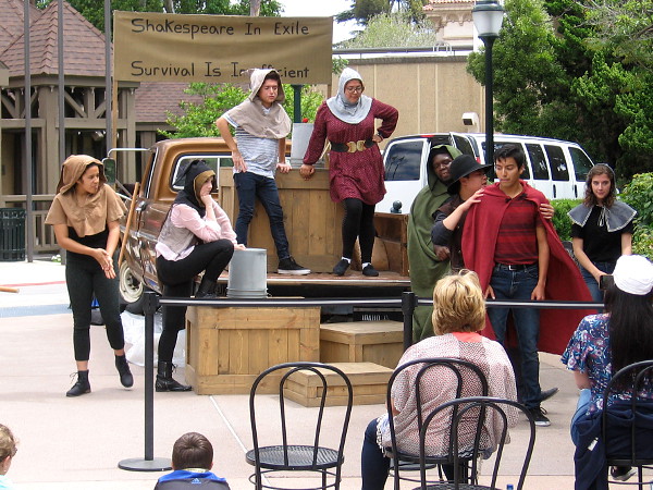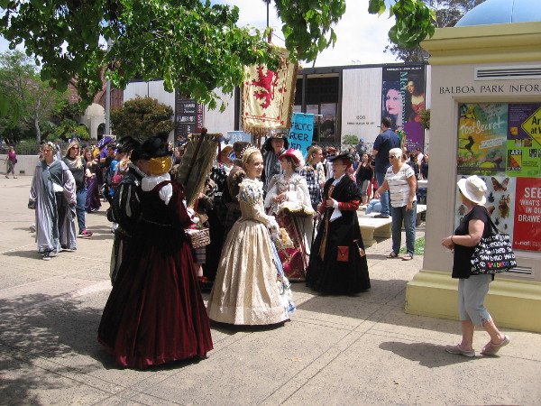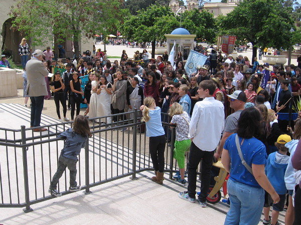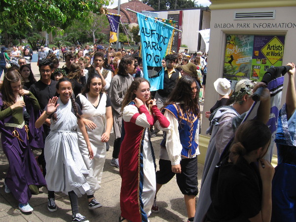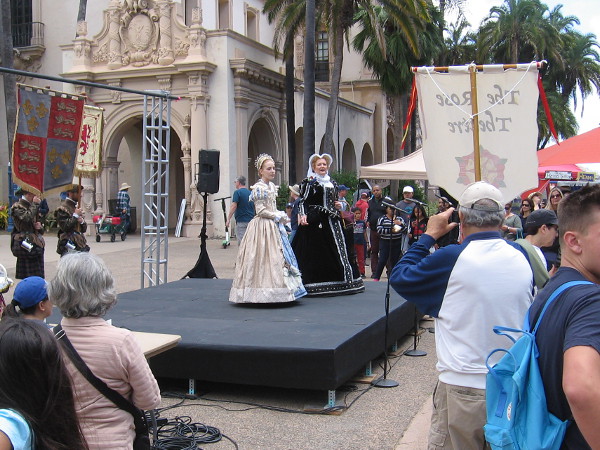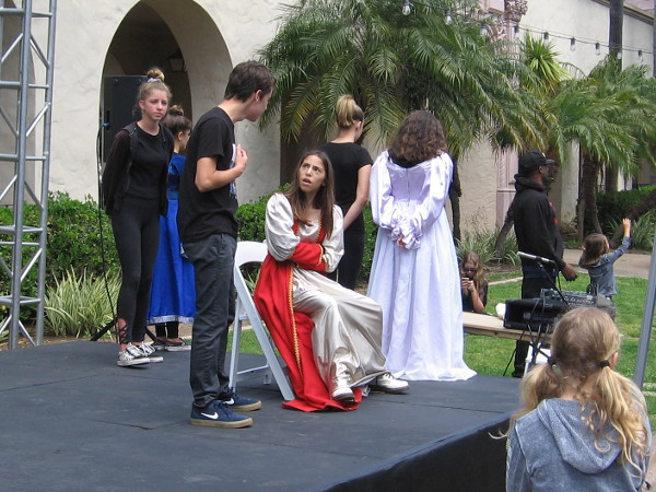 A bit after noon high school students from all around San Diego gathered on the steps of the Timken Museum of Art. After a welcome speech, a fantastic parade featuring many Elizabethan costumes began along El Prado. Several students were presented with achievement awards at the foot of the Lily Pond as their classmates shouted approval, then the youth fanned out to perform scenes from Shakespeare and other famous plays on several stages along El Prado.
