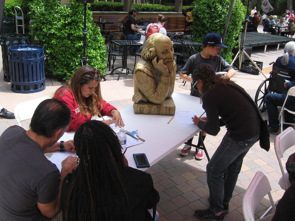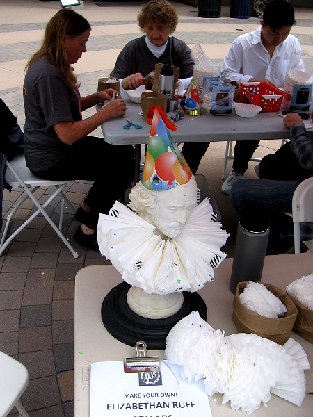 Many activities were centered in sunny Copley Plaza, the hub of The Old Globe’s Conrad Prebys Theatre Center. There was an outdoor performance of Shakespeare in Exile by Grossmont College Theatre Arts students. There was instrumental musical entertainment, a sonnet writing contest, and even an Elizabethan ruff-making station. Inside the lobby of The Old Globe, costumes from some of their past Shakespearean productions were on display.