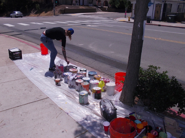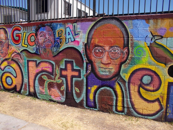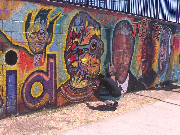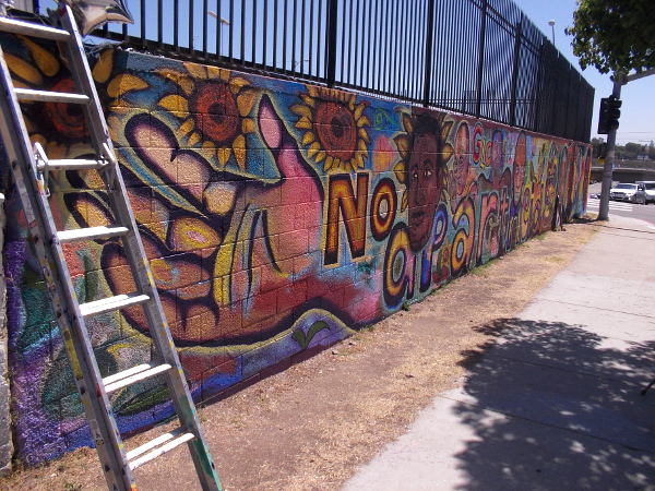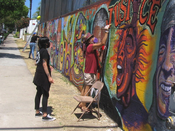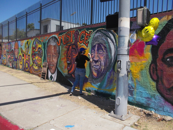 Today I headed down to 32nd Street and Imperial Avenue to see the work being done to restore an important mural by internationally recognized muralist Mario Torero. When I arrived several local artists were gathering for the day’s work, and shortly thereafter an energetic Mario Torero himself showed up!
