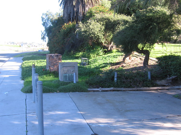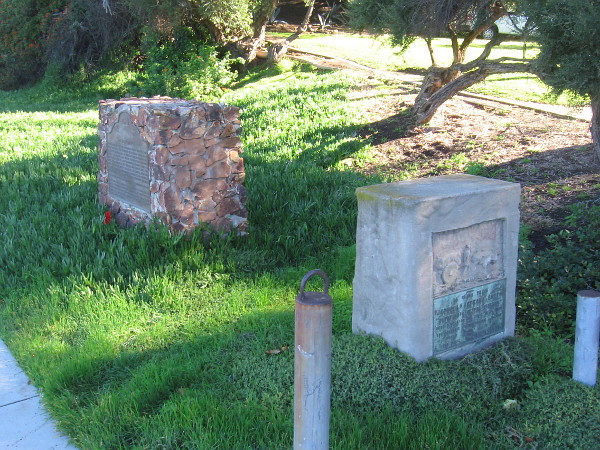 According to Wikipedia: “In 1934, six commemorative terra cotta plaques were placed along the length of the trail by the local chapter of the Daughters of the American Revolution and other groups, based on a relief designed by sculptor Rose M. Hanks. The original six were located at Mission San Diego de Alcala; at the foot of Presidio Hill in Old Town; near the intersection of Rosecrans St. and Midway Blvd. in the Midway area; at the corner of Rosecrans and Lytton streets in Loma Portal, across from the Naval Training Center San Diego golf course; at the corner of Rosecrans and Byron streets in Roseville; and at the site of the fuel depot at Naval Base Point Loma…”