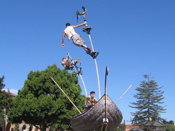 The first production I watched, titled Tall Tales of the High Seas, was a very unique visual drama that seemed part circus act, part aerial dance. The athletic performers raised the flexible masts of a rotating Viking longship, then climbed skyward to dip, fly and swerve through the sky! One could sense a bit of a story unfolding as the ship seemed to become lost at sea and the actors hung limp from the crow’s nests without hope; then land is sighted and excitement takes hold!