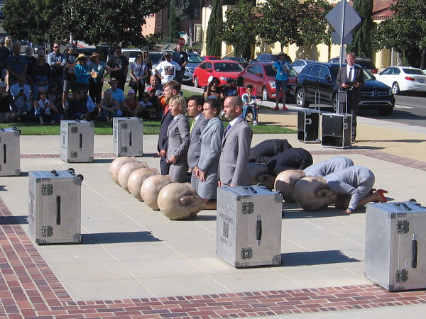 The actors bowed before their enormous masks, inserted their heads, rose up in a row, and suddenly each head was identically serious, grim, tired and sad. They filed about in a circular hurry, did the corporate dance, bowed to their boss, became jackasses when commanded to do so, engaged in power plays and subterfuge–you know, all that ridiculous, demeaning stuff that pains the heart when people shed their dignity in their desire for power, position or money.