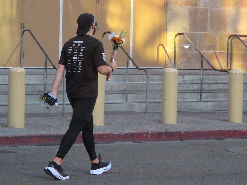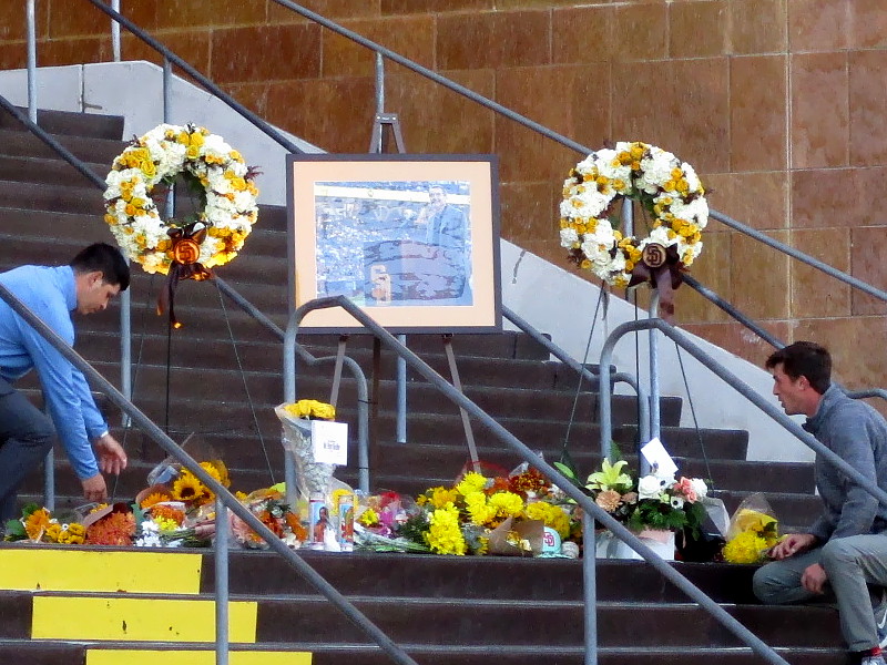 This afternoon, on the steps of Petco Park, members of the Padres staff were building a memorial full of flowers and memories. I walked by to see.