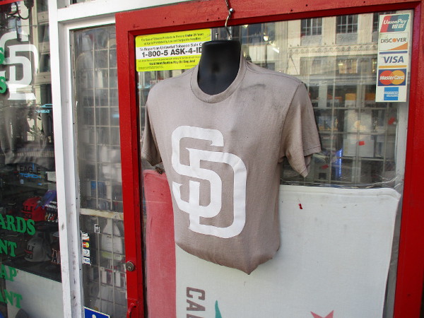 Several shops in the Gaslamp have Padres apparel out on display.
