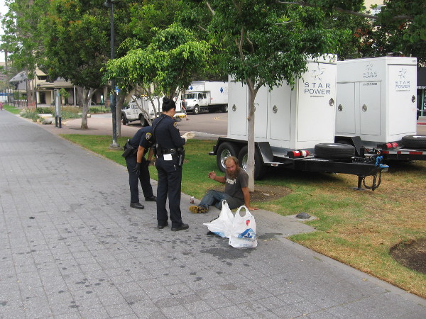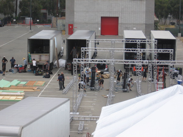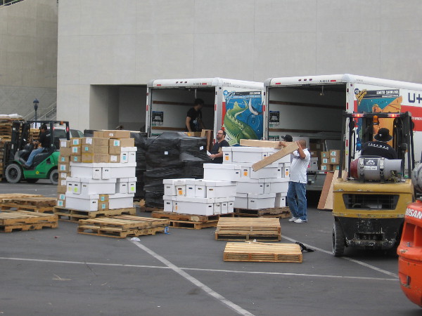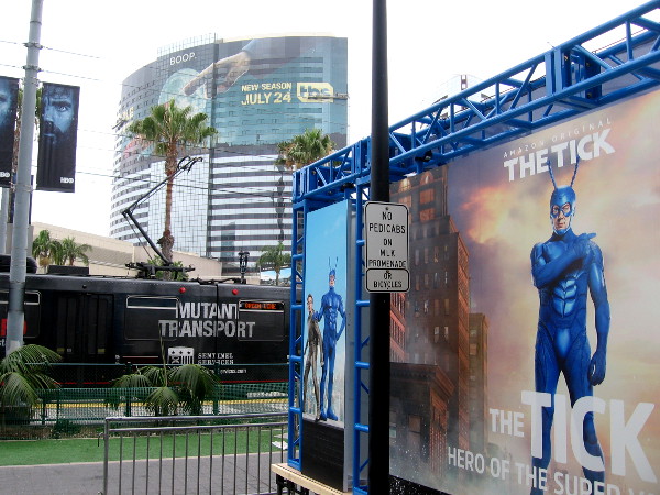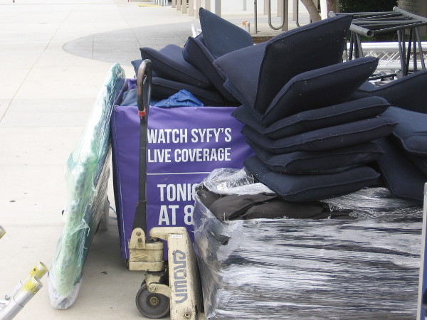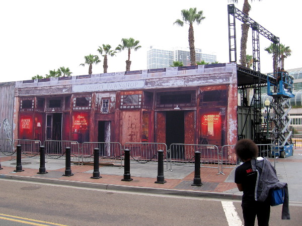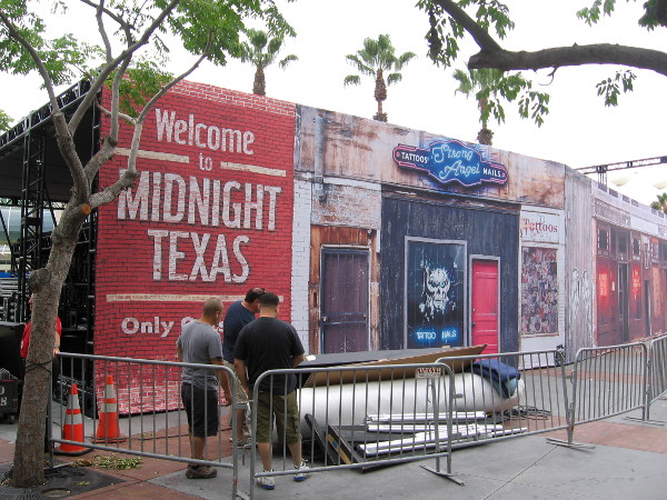 A wrap is going up on Petco Park promoting History’s new series Knightfall, concerning the Knights Templar.Local businesses in the Gaslamp are also getting ready for Comic-Con, which officially begins in less than three days!It looks like a cool Archangel wrap is now going up on the Hard Rock Hotel. Skydance Interactive’s first virtual reality offering should be popular at Comic-Con.Parking will be very difficult in downtown San Diego during Comic-Con. Take the trolley!Nearby businesses are looking forward to the crowds!This will be AMC’s Deadquarters. I expect there will be zombies.Some stuff in a pile that will probably be used as props at Deadquarters.At The Tick Takeover, the superhero and Arthur are accompanied by a worker. I’m told smoke will come out of this blasted hole once everything is completed!Two huge Tick antennae will also move about!Arthur seems to be in a bad situation at The Tick Takeover site at Comic-Con.A cool convergence near Harbor Drive. Dozens of trolley cars are now wrapped and ready.The People of Earth wrap on the Marriott Marquis is approaching completion.The front of the Blade Runner 2049 Experience hasn’t changed much in the past couple days. I’m sure lots of cool stuff is jammed inside the gigantic pavilion.Workers carry stuff into the Hilton Gaslamp, where Netflix is headquartered.Everybody is getting ready, including the police. Homeless are removed from the area before Comic-Con. A tragic, extremely sad truth that many visitors won’t see.The Midnight, Texas site promoting the new NBC show is starting to look interesting.The area near the Tin Fish has a Midnight, Texas theme this year.Banners now hang along the Tin Fish.There seems to be a room with video walls inside the Midnight, Texas 4D Experience.Lots of equipment to move, and work to be done!Some more graphics are up for Kong: Skull Island near the Omni Hotel.A closeup photo of one Skull Island graphic.Guys are putting up these long banners promoting HBO’s Game of Thrones.No wraps up yet on this corner of Petco Park.Construction has just commenced in the Petco Interactive Zone, now that the Padres have left for a road trip.Lots of canopies for long lines are up at the San Diego Convention Center. Looks to me like 2017 Comic-Con is almost here!The FXhibition outdoor site near the Hilton Bayfront is still under construction.I see there will be an X-Gene Screening Station in Fox Television’s outdoor area.A reminder that Syfy will provide live coverage of Comic-Con.Exhibitors large and small are unloading behind the convention center. I bet there’s a mad scramble inside as booths are prepared. (Check out all the comic book boxes! That’s a lot of reading material!)A cool Legion wrap is going up on the Hilton for 2017 San Diego Comic-Con!
