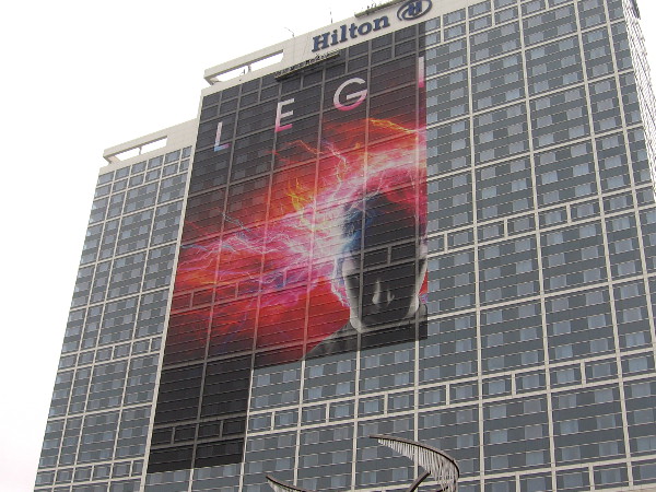 The Knightfall wrap is now complete at Petco.More graphics have appeared at Kong: Skull Island.And so has a skull!And more huge bones!One of various Midnight, Texas posters up now at the Gaslamp trolley station.A wrap is going up on this section of Petco Park. I believe this will promote Once Upon a Time.I now see Archer graphics in the FX area near the Hilton.And more X-Gene Screening Station stuff in the FOX area.I see Adult Swim will give away free shirts again this year.The big Legion wrap is making progress as you can see beyond the Adult Swim site.The Legion wrap not quite complete on the Hilton, as seen from Embarcadero Marina Park South.