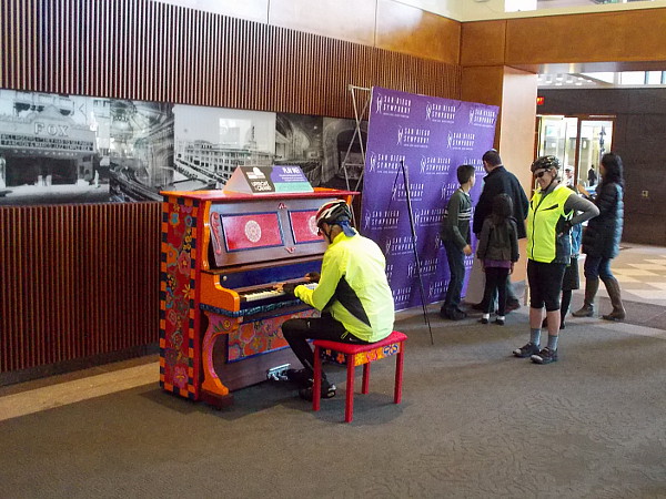 Some bicyclists stopped by to play the public upright piano in the lobby of Symphony Towers near the box office.
