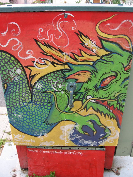 A wreath in front of the San Diego Police Headquarters’ Wall of Honor is the remnant of a recent memorial ceremony. The wall is inscribed with the names of all police officers killed in the line of duty since 1913.A prayer on Broadway. Shelter my brothers and sisters in arms who have fallen in the fight. Let their stars, lit by your love, shine brightly through the night.A sign points to Golden Hill as I walk east up Broadway from downtown San Diego.Looking back west toward downtown. Many jacaranda trees line San Diego’s streets. A man waits at a bus stop.Crazy decal on the back of a stop sign.A utility box with a bit of funny urban art. This tired buffalo appears to be crunching some numbers.A nicely restored Victorian residence on sloping Broadway, photographed while heading up Golden Hill. This neighborhood contains many historic houses. A hundred years ago, this area on a scenic hill near downtown was very affluent.One side of a utility box has been boldly painted with a fiery green dragon.A lady and a scaly dragon on the opposite side of the box. A floral mural decorates a nearby store’s wall.The San Diego Reader is a very popular alternative weekly newspaper in our city. Their headquarters is located on Broadway in Golden Hill.The 1896 Quartermass-Wilde House is a San Diego Historic Landmark. It’s difficult to miss! This elegant Victorian is an outstanding example of Queen Anne style architecture.Lots of balloons and flowers for sale at the corner of Broadway and 25th Street. It’s Mother’s Day.A beautiful bit of shining art inlaid in the sidewalk. A marker at the top of Golden Hill.San Diego Fire Station 11, at the corner of Broadway and 25th Street. It’s a perfect day for a walk!A Mexican taco shop has graffiti on the windows. The neighborhood today is slightly neglected, but sunny and pleasant.A wooden fence along the sidewalk contains amazing, colorful murals, beginning with this flowery skull.A brilliant butterfly spotted on Broadway, near the top of Golden Hill!A hummingbird drawn like ancient Southwestern rock art.A magical lady, eyeball plants and an unfinished Simba.Someone walks west along the Broadway sidewalk. I continued east, turned north up 28th Street and directed my feet toward South Park.