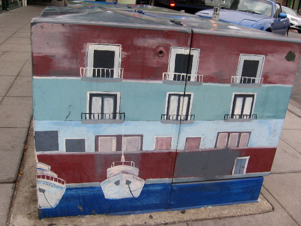 Little Italy art on utility box shows boats in water beneath row of windows.Fish and fishermen are big themes on Little Italy utility boxes.Tropical beach island scene on a fun, eye-catching Gaslamp utility box.Soft and peaceful beach image on this Imperial Beach utility box.Cool abstract face on an imaginative Hillcrest utility box.Some large utility boxes in Hillcrest feature photos of fruits and vegetables.This Hillcrest electrical transformer has a bold blue eye.East Village utility box art has been vandalized with angry words.Very colorful artwork on an East Village transformer.
