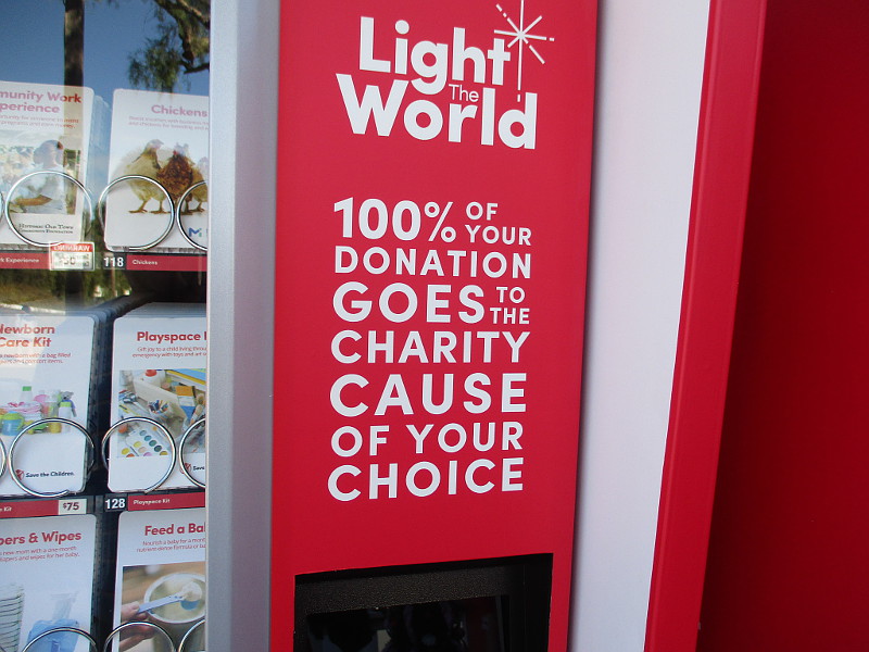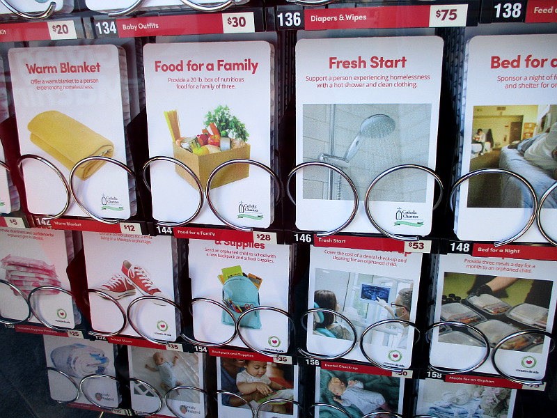 Charities that benefit when you use the Giving Machine include Save the Children, Catholic Charities, Corazon de Vida, Birthline of San Diego, Gently Hugged, and Mentors International. Struggling people, including the homeless, are helped locally and around the world.