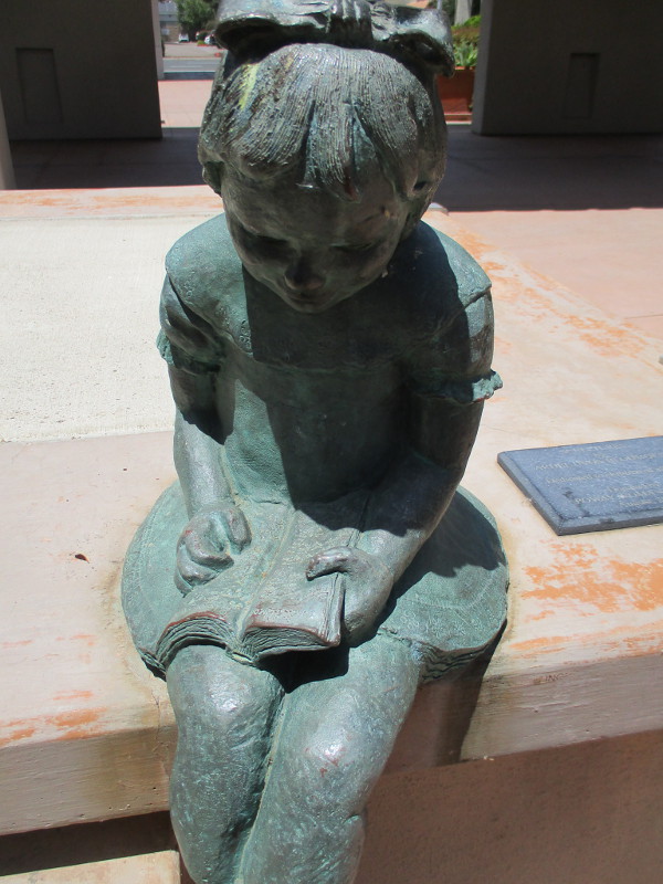 As the girl sits reading a book, the boy walks along carrying his own book, no doubt checked out from this Poway Branch of the San Diego County Library.