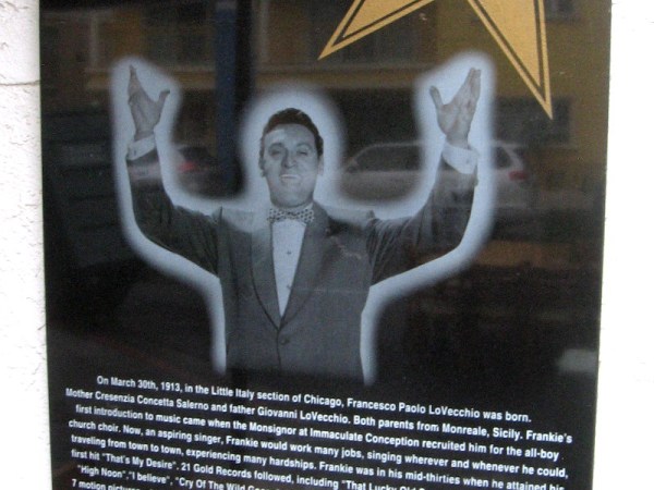 A life-size bronze statue of legendary entertainer Frankie Laine (born Francesco Paolo LoVecchio) was dedicated this summer in Little Italy. It now stands in front of Nonna, an Italian restaurant owned by Frankie’s long-time friend Joe Busalacchi. You can learn a little more about this statue at the Team Frankie Laine blog here.
