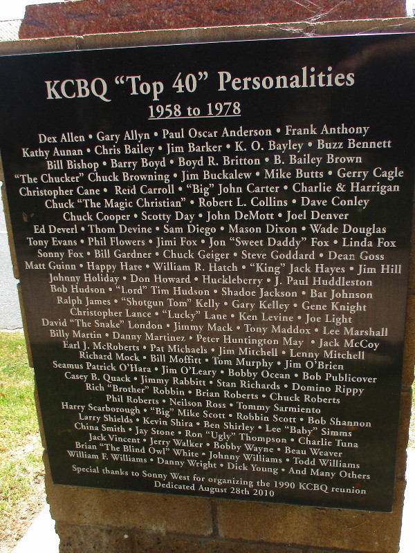A monument to the original KCBQ, which was influential in popularizing the Top 40 music format for the rest of the nation, now stands at the radio station’s old Santee transmitter site. It was dedicated on August 28, 2010. You can find the monument on Mission Gorge Road just east of Carlton Hills Boulevard, in front of an In-N-Out Burger fast food restaurant.