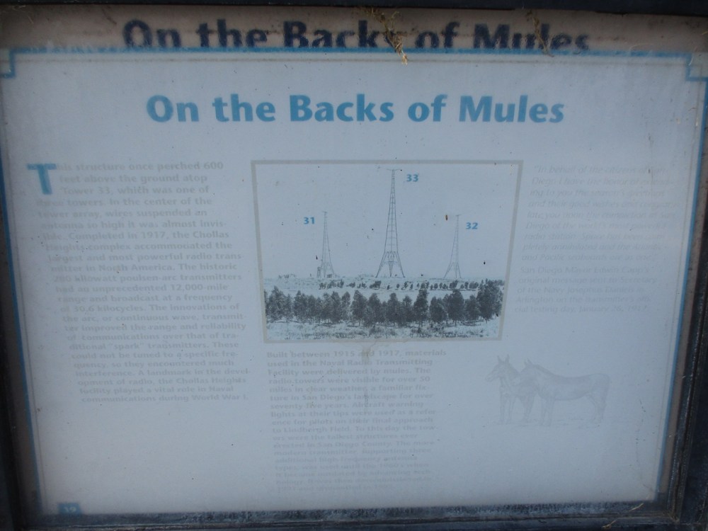 Built between 1915 and 1917, materials used in the Naval Radio Transmitting Facility were delivered by mules. The radio towers were visible for over 50 miles in clear weather, a familiar fixture in San Diego’s landscape for over seventy five years. Aircraft warning lights at their tips were used as a reference for pilots on their final approach to Lindbergh Field. To this day the towers were the tallest structures ever erected in San Diego County. The more modern transmitter, supporting three additional high-frequency antenna types, was used until the 1960’s, when it became outdated by advancing technology. It was then decommissioned in 1991 and dismantled in 1995.