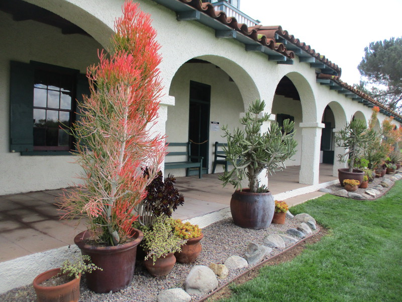 I approached the Guajome Ranch House from the Santa Fe Trail to its south, then circled counterclockwise around the complex, viewing the beautiful arcaded veranda, several cisterns fed by wells, the chapel, and other outbuildings. I spotted various signs and plaques relating the history of the ranch, which was once the home of prominent early San Diego resident Cave Johnson Couts and his wife Maria Ysidora Barbara Bandini.