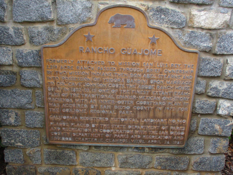 Formerly attached to Mission San Luis Rey, the 2,219 acre ranch passed through brief ownership by two mission Indians, then Don Abel Stearns, and into possession of Ysidora Bandini upon marriage to Col. Cave Johnson Couts. The adobe ranch house built in 1852-53, is one of the finest extant examples of the traditional Spanish-Mexican one-story hacienda with an inner-outer courtyard plan. It was acquired by San Diego County in 1973 for the Guajome Regional Park.
