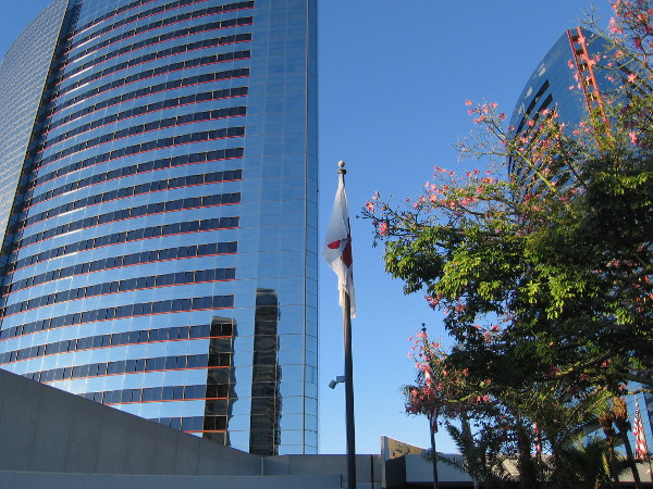 The silvery curving towers of the Marriott Marquis as seen from across Harbor Drive. The cluster of trees on the right contains a wonderful secret.