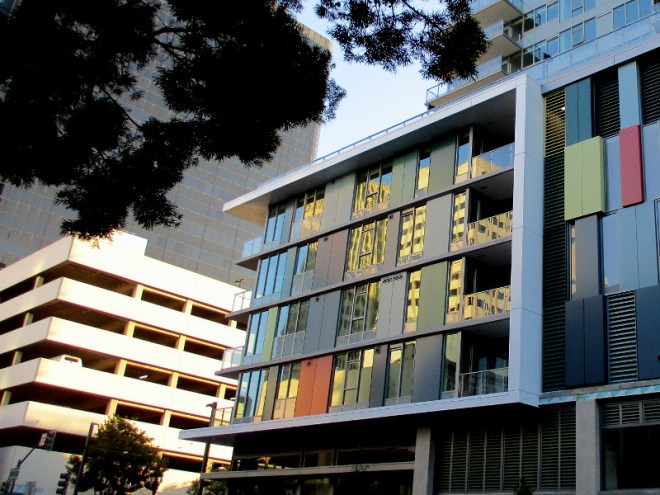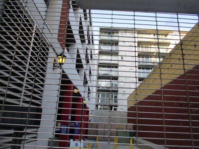 I was standing in front of the Santa Fe Depot waiting for a bus, gazing across the street at America Plaza and its trolley station, watching people and their movement, seeing strange reflections on nearby buildings–life and light dancing mysteriously–when I lifted my camera…