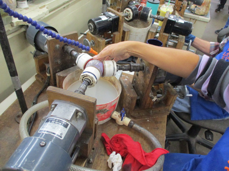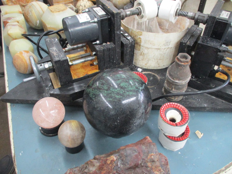 During my behind-the-scenes look yesterday, I spoke to one friendly teacher and watched students grinding and polishing minerals using specialized machines. And I took these photographs in the “cab room” where spheres and cabochons are created!