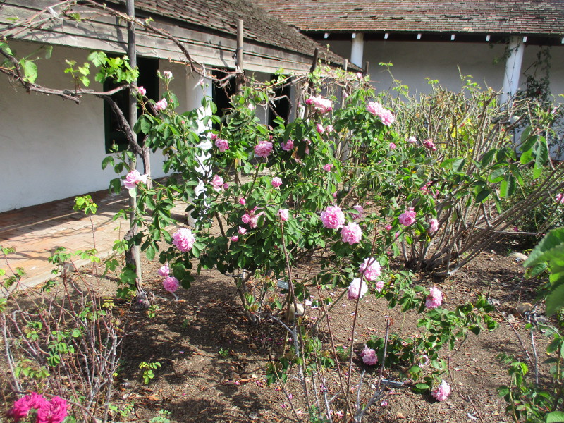 After turning down a path behind several historic buildings, I noticed bright spring colors in a garden that few visitors see. A straggly, uniquely beautiful rose garden can be enjoyed behind the reconstructed La Casa de Machado y Wrightington, which today is home to the Tafoya and Son pottery shop.