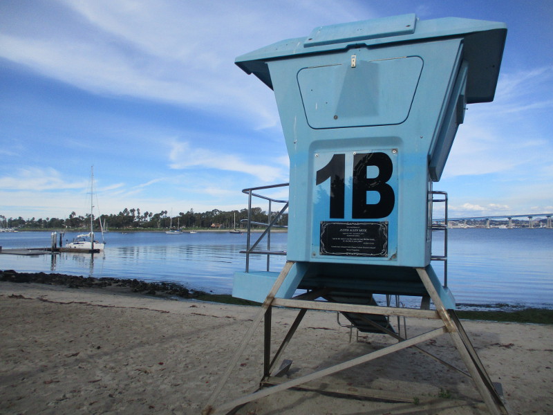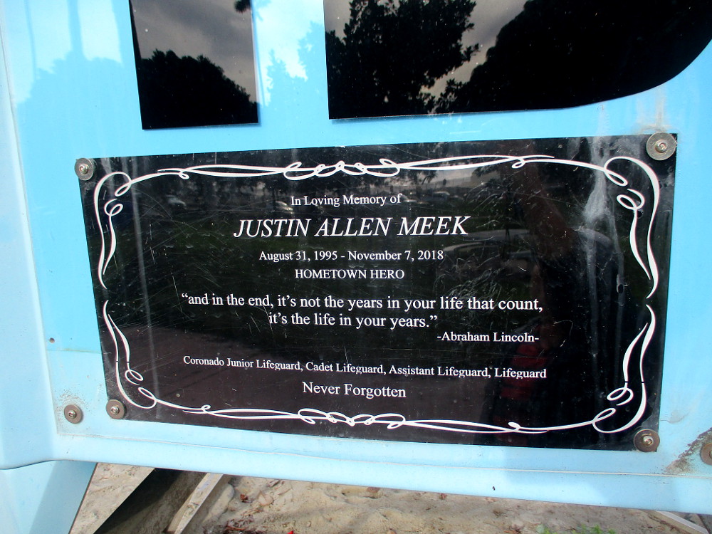 In Coronado, Lifeguard Tower 1B on the beach of Glorietta Bay Park honors a hometown hero. A plaque on the tower is In Loving Memory of Justin Allen Meek.