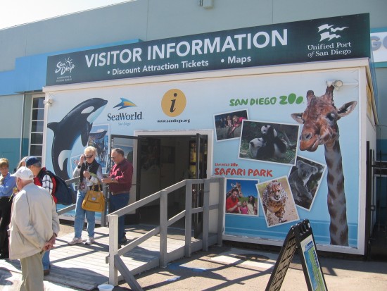 Coast Guard cutter docked at San Diego Cruise Ship Terminal.Tourists at the Visitor Information shack.Kid kicks a ball on the grass in Ruocco Park.Stone and steel ants by an artist near Seaport Village.Balloon Mario, Little Mermaid and Hulk attract kids.Children’s Miracle Network volunteers near Tuna Harbor.Heron stands on rocks beside San Diego Bay.Colorful pedicab drivers wait on Embarcadero for riders.Street performer plays sax by the USS Midway.Balloon twister guy sits patiently on the Embarcadero.