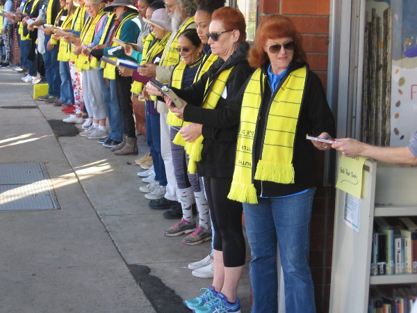 Library books are transported by public volunteers from an old branch library to a brand new building down the street. Those who will participate in the historic Book Pass, wearing yellow scarves, fan out along seven blocks of West Washington Street in Mission Hills.