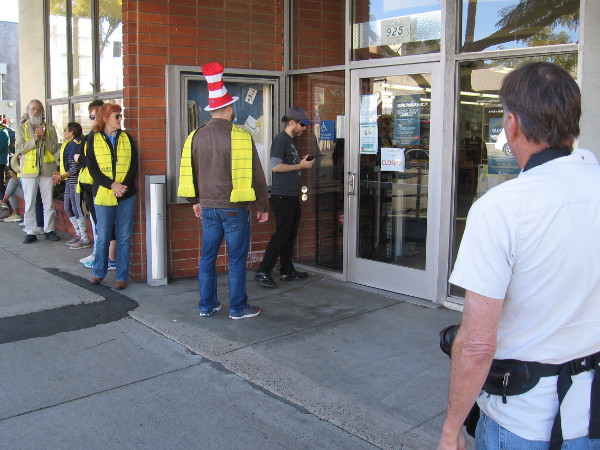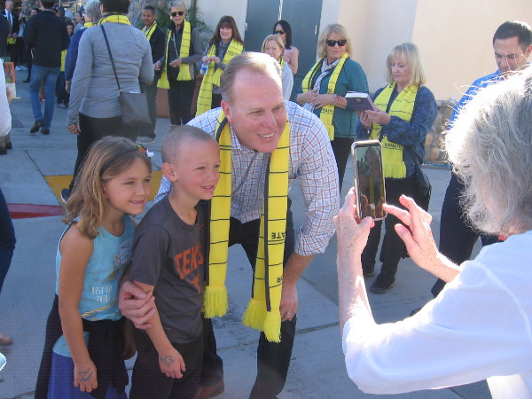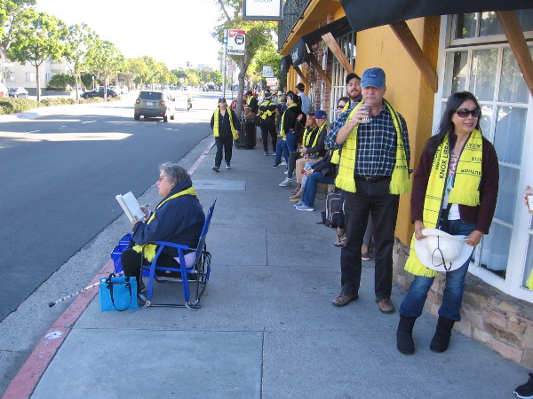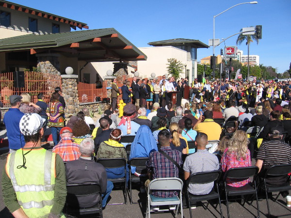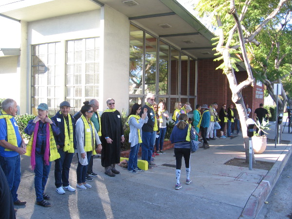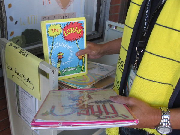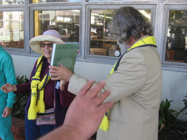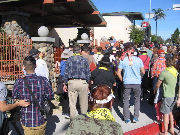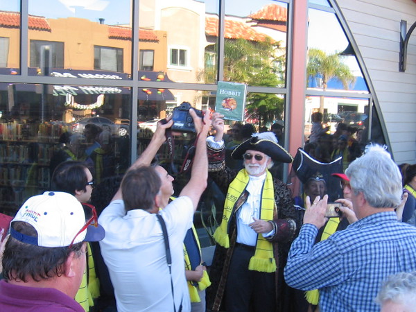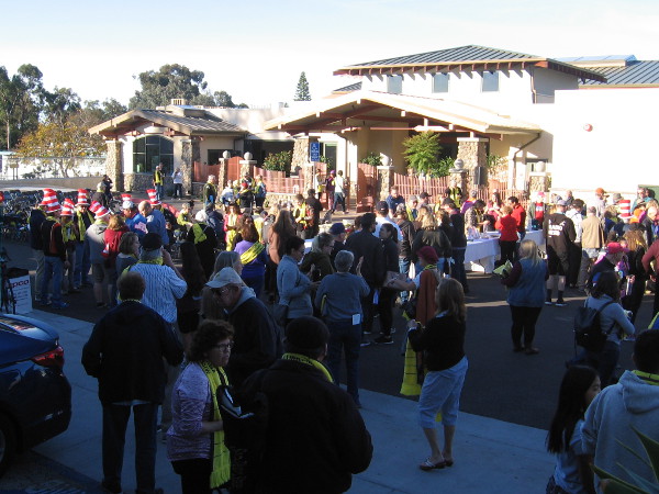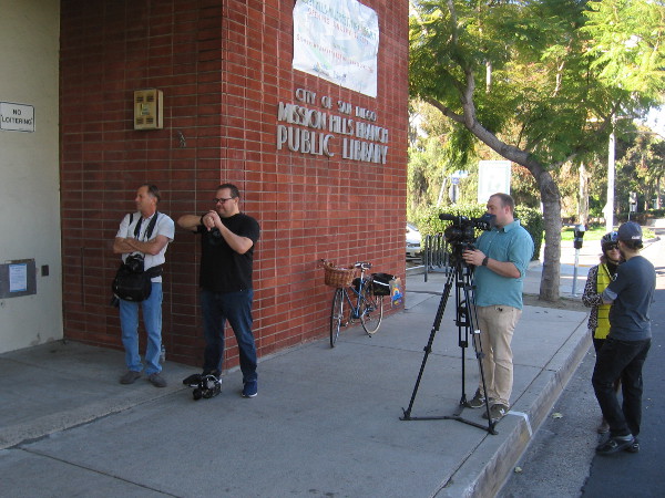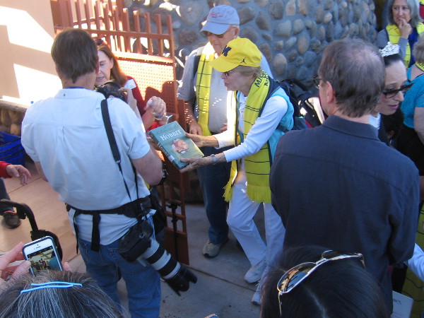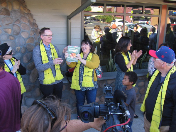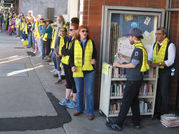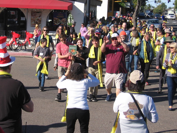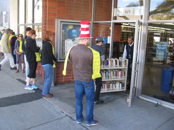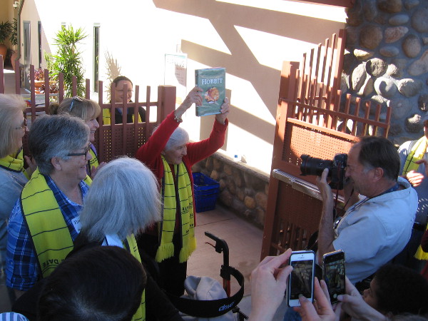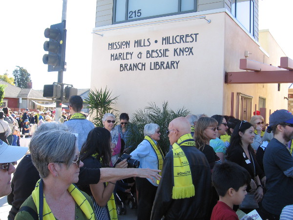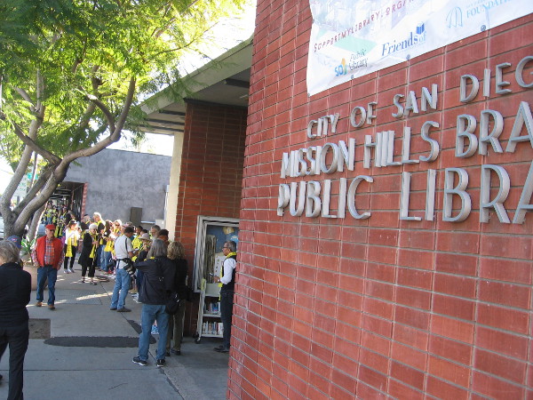 Volunteers for the Book Pass gather in front of the new Mission Hills-Hillcrest/Harley & Bessie Knox Library.Those who will participate in the historic Book Pass, wearing yellow scarves, fan out along seven blocks of West Washington Street in Mission Hills.Members of the Book Brigade are getting ready on Block 3.Someone reads while waiting for the Book Pass to begin.Look! It’s Balboa Park’s Ranger Kim Duclo, with his cool new children’s book!This person’s favorite book is Peter Benchley’s Jaws!I spotted Cruella de Vil, Maleficent and Captain Hook!Here comes Professor Trelawney!Near the brand new Mission Hills-Hillcrest Branch Library, the Book Pass is almost ready to begin.Volunteers are lined up by the old branch library, awaiting the first book!Cameras ready!A fun moment in history is about to begin…The final 200 books in the now closed branch library will be passed from hand to hand to the brand new Mission Hills-Hillcrest Library.Here they are on a book cart!Empty shelves are all that’s left in the old Mission Hills Branch Library.And here comes the very first book in the Book Pass!Doing the wave! Too much excitement!Library books are transported by the hands of those who love to read to their new home.The books head east through Mission Hills.Here they come!People pause to look at titles as the books are passed along. Most of the books are classic works of World Literature.Very quickly the cart is almost half emptied!The smiling Bike Brigade showed up to transport a few books!There it is! The final book of the Book Pass is waiting at the bottom of this stack. The Hobbit! (It happens to be one of my favorites!)The final 25 books represent the 25 most checked-out books in the history of the old, now closed Mission Hills Branch Library. I noticed several were by Dr. Seuss.Finally, it’s J. R. R. Tolkien’s beloved fantasy novel The Hobbit.It seems Bilbo Baggins has embarked on another journey. The Hobbit makes it’s way to the brand new Mission Hills-Hillcrest Branch Library.Friends and neighbors are excited to be a part of history in San Diego.A happy kid hurries across an intersection with The Hobbit!Everyone holds up The Hobbit as many photographs are taken.One of many wonderful Book Pass memories for hundreds of participants.A huge crowd accompanies The Hobbit across another intersection as the Book Pass approaches the new branch library.The beautiful new Mission Hills-Hillcrest/Harley & Bessie Knox Library is now in sight!San Diego Mayor Kevin Faulconer poses with some kids for a photo.The Hobbit is approaching its new library home!A favorite book held high for all to see!One last book and the historic Book Pass transfer will be complete.Many have gathered for the Grand Opening ceremony at the new Mission Hills-Hillcrest/Harley & Bessie Knox Branch Library.The Hobbit has reached its new home.Speeches begin. The Mayor of San Diego addresses a large crowd. The beautiful new library, which was built in the Craftsman architectural style, is finally ready to open.People eagerly head into the brand new Mission Hills-Hillcrest Branch Library!On we go!