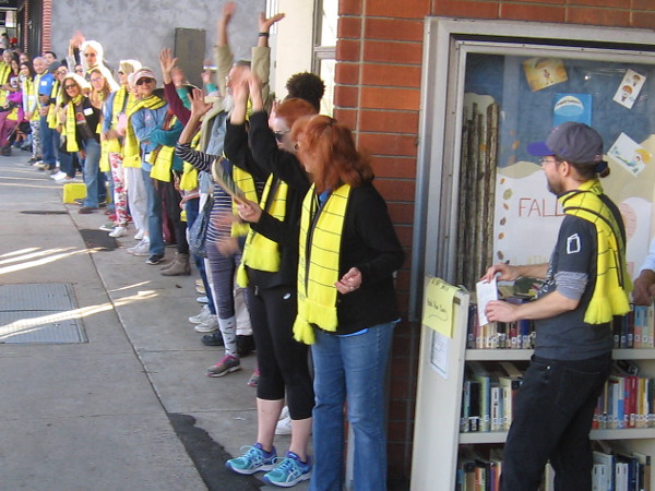 The final 200 books from the old branch library were transferred along the sidewalk, hand-to-hand, by volunteer participants. Some were dressed as favorite book characters. All eyes glanced at the passing titles, and many smiles resulted!
