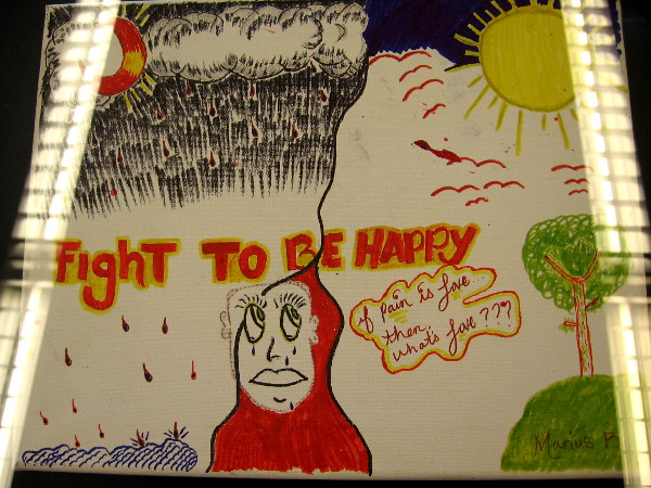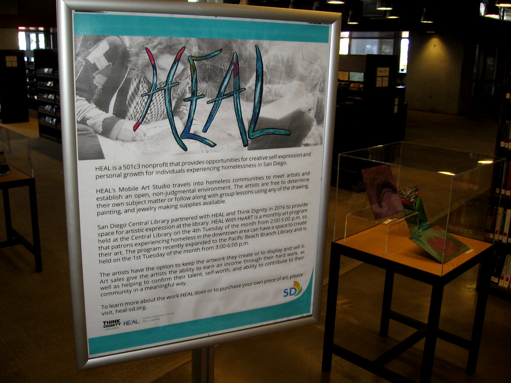 HEAL is a nonprofit that provides opportunities for creative self-expression and personal growth for individuals experiencing homelessness in San Diego.Many expressive works by talented artists are now on display at the San Diego Central Library.Blue Eye, by Dominique H.Fight To Be Happy, by Marius.HEAL is Homeless Empowerment Through Art and Leadership. Their mobile art studio is free. Locations include Pacific Beach, Ocean Beach, and downtown San Diego. (Click the above image to expand it, for easy reading of days and times.)Love Is Eternal Tree, by Jolie.Geo Wood Collage, by Ben.Circle Mandala, by Votive.A Look Into My Mind, by David R.Sunny Day, by Carlos.Shells By The River, by Propane Purps.I Beseech You . . . Crows, by V The Artist.Memories Of The Caribbean, by Dario D.A very beautiful work of art. I apologize for not knowing the title or the artist’s name.Pink Sky, by Helena D.River And Pine Trees, by Timothy R.Hindi Girl, by Shawn L.Woman With Afro, by Dominique H.Palms On The Beach, by Lawrence S.Colorful Zig Zags, by Zak T.Faces And Trees, by Vince and Leni.Teal Dragon, by Kayla.Eye On A Butterfly, by Jelyn E.Floating Face, by Kermina P.