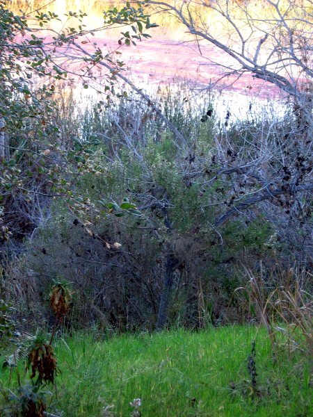 This morning, during my walk to work through Mission Valley, I was fortunate to capture some weirdly artistic photographs. I paused a few times on the south side of the San Diego River as the sun rose. The slanting light illuminated patches of red algae, bright green reeds and tangles of dry branches.