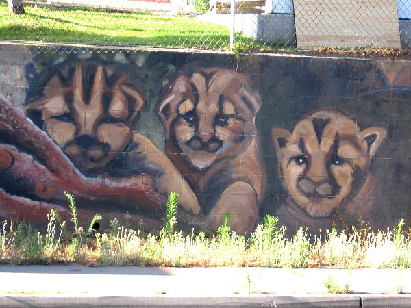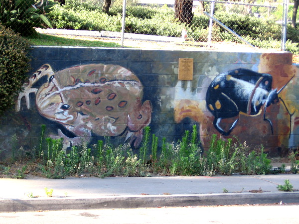 I love this mural in Mission Valley. I remember driving through the intersection at Qualcomm Way and Camino de la Reina years ago, and seeing a whole bunch of people painting wild river animals along the ugly low wall. A little research today tells me that memory was from late 2009.