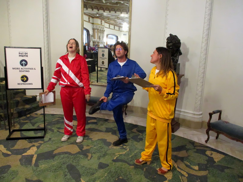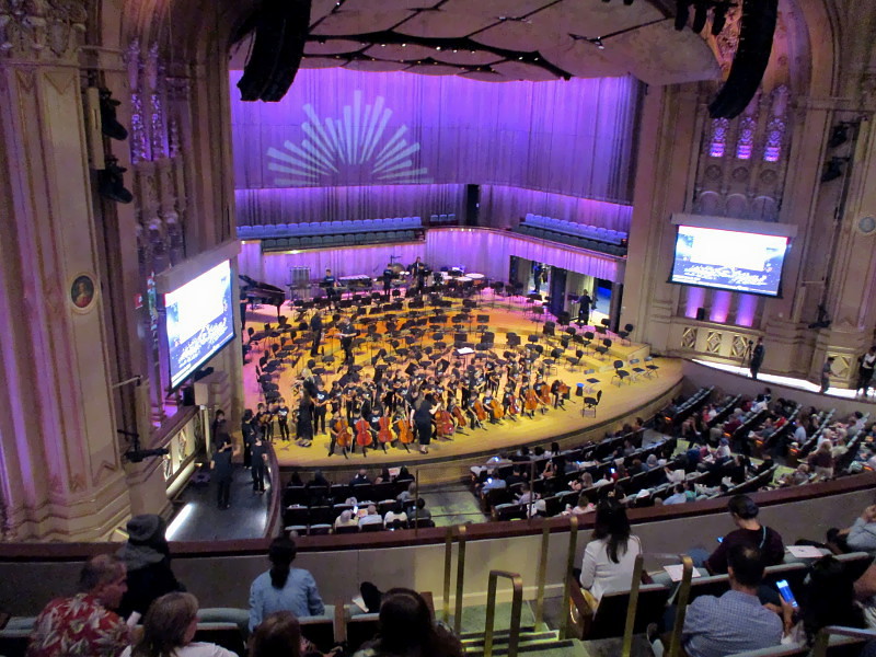 On the sidewalk outside Symphony Towers, performers from Animal Cracker Conspiracy welcome arriving guests.The Mainly Mozart Youth Orchestra creates beautiful music inside the Box Office Lobby.A smile greets me at the Mainly Mozart Youth Orchestra table!The Coronado School of the Arts has a theatrical performance of The Addams Family coming up! I learned Lurch is one of the characters!Joey’s Wings performs, in an effort to fight childhood cancer. (See my previous blog post.)Actors from Project [BLANK] perform in one corner of the San Diego Symphony concessions area. You provide the subject matter and they act it out!Here I am walking into the breathtaking Jacobs Music Center.Gazing to one side. Long ago, the San Diego Symphony’s home was a luxurious FOX Theatre movie palace. The skyscraper Symphony Towers was built above and around it!The 1st Marine Division Band takes the stage.All stand for the Star Spangled Banner.An outstanding musical performance by our local Marines.Looking up toward the balcony seating when the performance ends. The Jacobs Music Center is like a splendid palace.I’m now on the upper level looking down between performances. The general lighting has turned from blue to purple.Another look toward the ceiling. Wow.Our Youth, the next segment of the day’s program, is about to begin. It’s a free community Day of Music inside the spectacular Jacobs Music Center!
