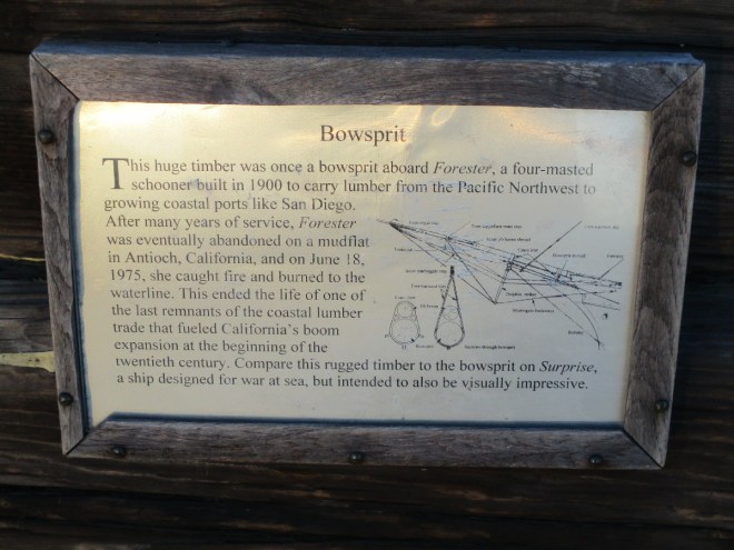 That’s the bowsprit of the old four-masted schooner Forester, built in 1900 to transport lumber from the Pacific Northwest to ports along the West Coast and destinations all around the Pacific Ocean, including China, India, Australia, South Sea islands and Peru.