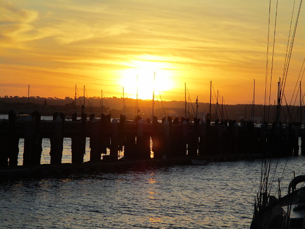 Masts and furled sails of the Spanish galleon replica San Salvador turn golden shortly after sunrise. Photo taken past the figurehead of Star of India.