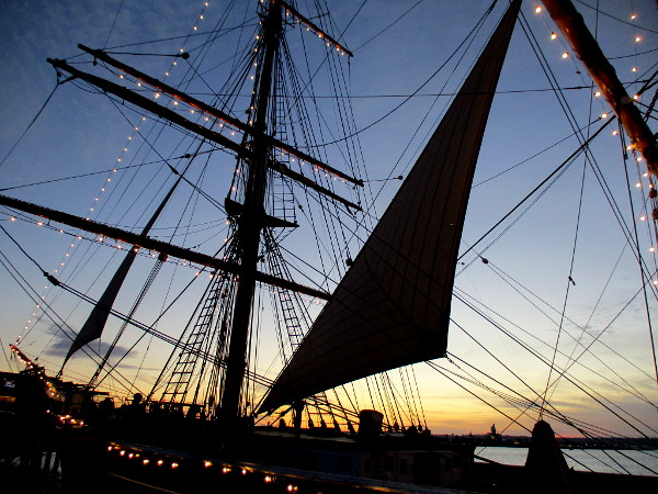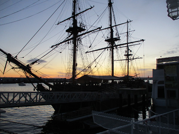 Sun setting over Point Loma, beyond the Grape Street pier.A sailboat passes behind one of the docked Hornblower ships.San Salvador and Californian a few minutes after the sun vanishes behind Point Loma.HMS Surprise darkens while sunset colors linger.Lights are strung high above on Star of India.