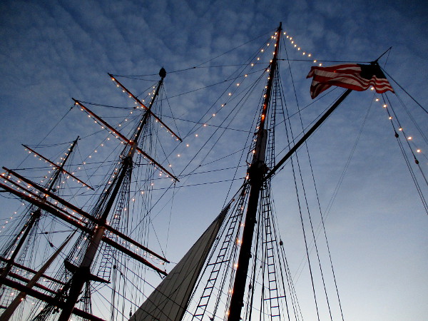 Visitors to the Maritime Museum of San Diego pause on the beautiful ship San Salvador as evening slowly turns to night.